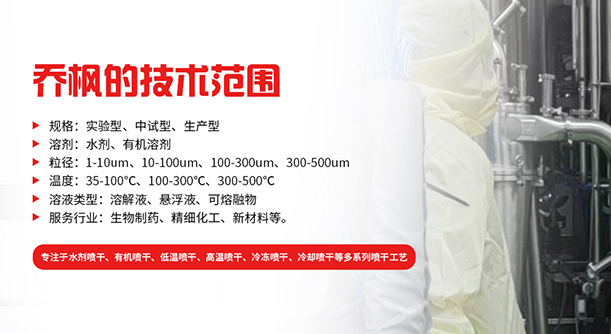 上海喬楓實業(yè)有限公司,成立于2012年,是從事噴霧干燥設備的研發(fā)設計、生產、銷售(小型噴霧干燥機,實驗型噴霧干燥機,35℃低溫噴霧干燥機,有機溶劑噴霧干燥機,低溫閉式循環(huán)噴霧干燥機、超細粉末噴霧干燥機、噴霧冷凍干燥機、真空噴霧干燥機、氣流噴霧干燥機,噴霧造粒干燥機,離心噴霧干燥機,沸騰制粒機等)和售后于一體的綜合性公司,本公司現(xiàn)成為一家致力于為生物制藥、精細化工、新能源、陶瓷造粒及食品工程等領域提供全套解決方案的整線交鑰匙工程企業(yè)。